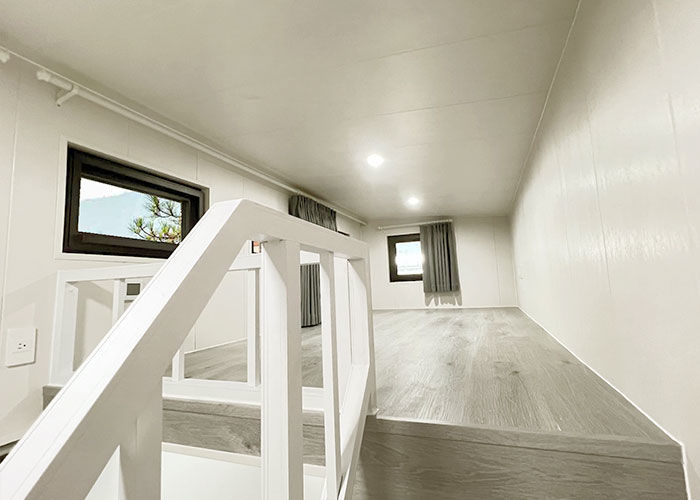 El acceso al loft principal es fácil gracias a las escaleras ingeniosamente diseñadas que funcionan como compartimientos de almacenamiento, maximizando el espacio disponible.4 m y dimensiones internas de 2.08 x 7.05m, la Cider Box Tiny House logra un equilibrio ideal entre compacidad y amplitud, lo que la convierte en una excelente opción para varios lugares y estilos de vida.